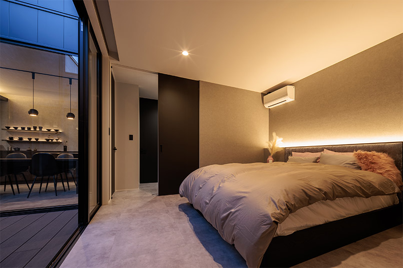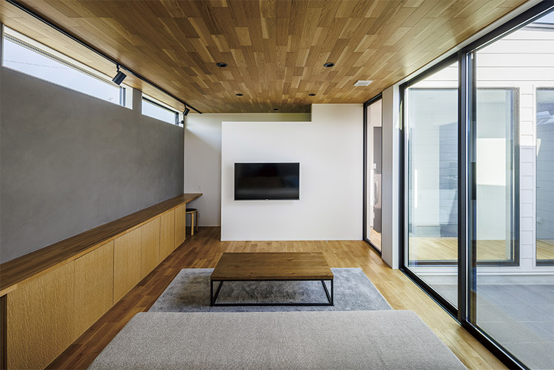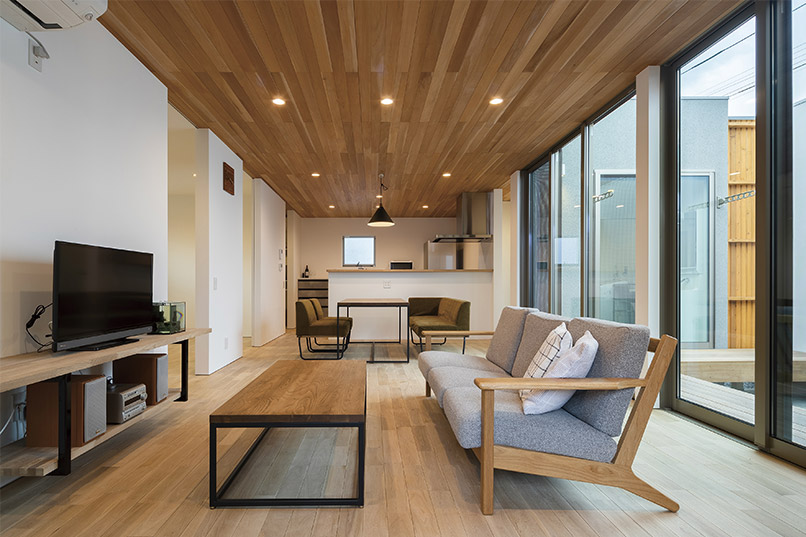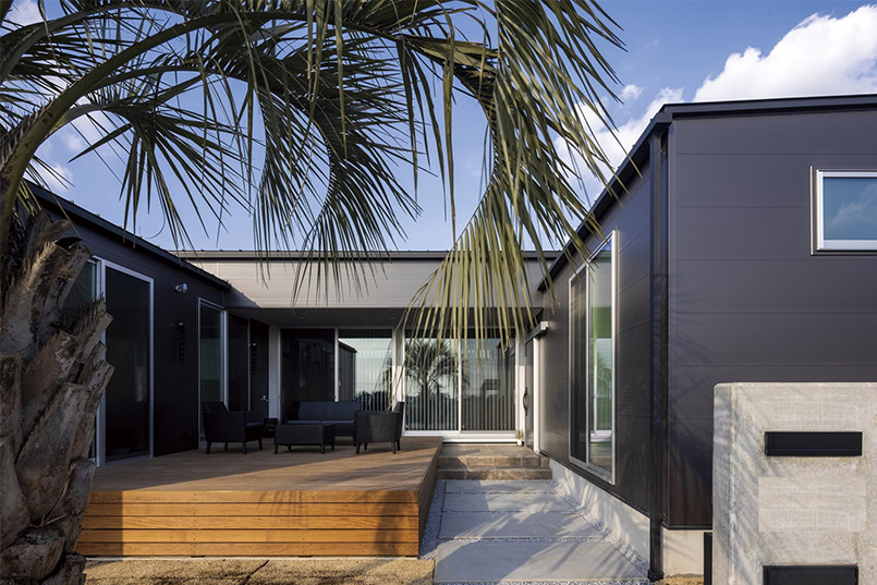 建物の中心に中庭を設けることで、外側に大きな窓をつくらなくても光を取り込むことが可能となり、同時に外部からの目線を気にせず開放感のある室内を実現できました。外観はブラックのガルバリウムとレッドシダーでメリハリのある印象に。