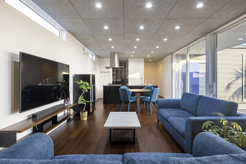 床と天井にはナラの無垢材を採用し、シックな佇まいの外観からは想像できない温かみのある室内となりました。家のどこにいても家族が繋がる、かけがえのない我が家です。