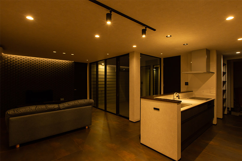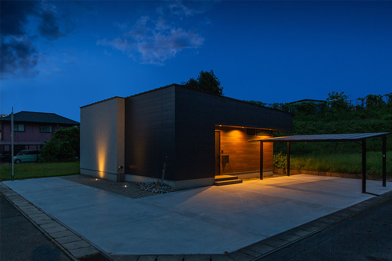 まるでギャラリーや一軒家レストランのようなクールな佇まいの平屋が完成しました。外観はテクスチャーの異なる外壁材を組み合わせ、大胆に斜めにカットした壁や室内の灯りがもれる格子がアクセント。シンボルツリーのココスヤシをライティングすると、壁面に浮かび上がる陰影が建物をより引き立てます。