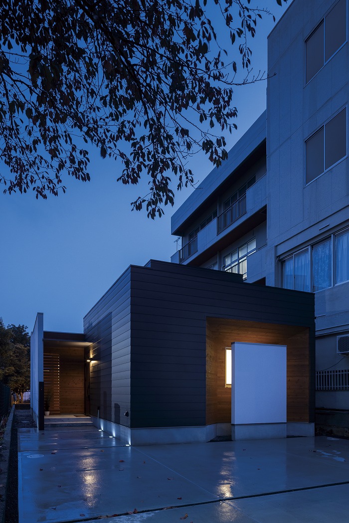外壁は黒いガルバリウムをベースとし、無垢材のレッドシダーをアクセントに採用することで、どこか温もりを感じる外観に。夜間に光がもれる格子窓も建物にかわいらしい印象を与えてくれます。