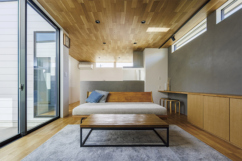 また、プライバシーを守るために格子の形状を菱形にするなど細部にもこだわりました。外観は周囲との調和を考えリシン吹付と木の組合せを採用し、斬新な形とは裏腹に落ち着いた飽きのこない和モダンテイストに仕上げました。漆喰の白い壁が上品で洗練された印象を与えます。また、断熱材にはセルロースファイバーを採用し、防音効果も高めています。